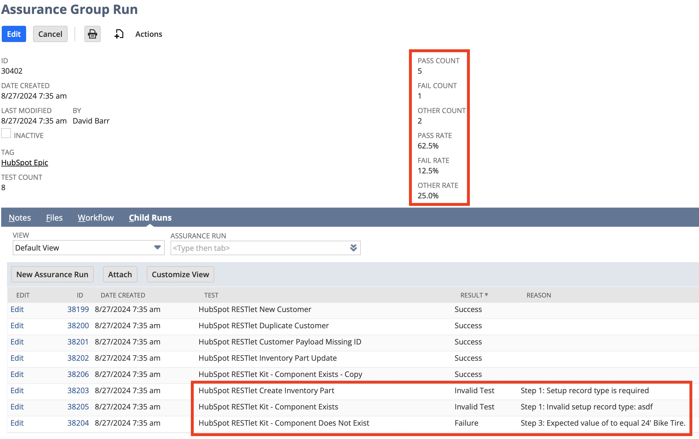 A Test is the smallest unit of work you can call. When you call a test it performs each of its Steps in subsequent order. When a test finishes, it creates a record called a Run that stores data, such as whether the test passed, as well as notes on what happened during the test, such as records created, RESTlet responses, and errors. You can also several tests at once, for instance you may want to run your entire testbed overnight. When several tests run together, they are create a Group Run. A Group Run is a collection of Runs and stores information such as the percentage of tests that passed and a list of tests that failed. The below picture shows a group run, where each line represent a run and the Test column represents the test that was run.